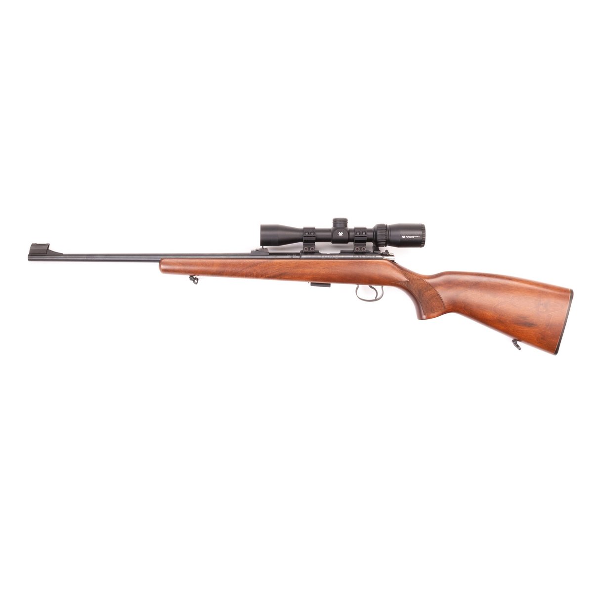 This CZ 455 features a wood stock with sling swivels, an adjustable rear sight with front blade sight, and a Vortex Crossfire II 2-7×32 scope. One 5-round magazine is included.